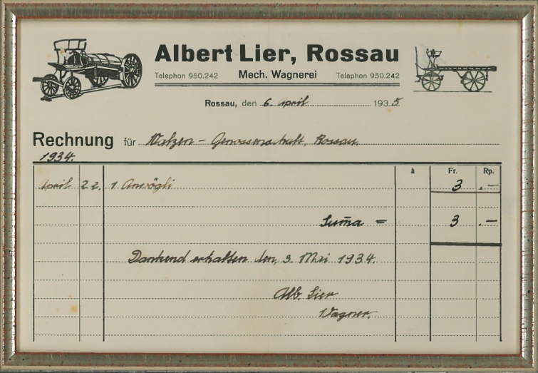 Im Jahre 1910 konnte die von der Wasserversorgungsgenossenschaft Rossau erstellte Wasserleitung zum Betrieb einer Turbine der Wagnerei Lier für den Betrieb genutzt werden. Für den enormen Wasserverbrauch der Turbine von Wagner Lier wird der Zins auf Fr. 100.- festgelegt, zu zahlen in 2 Raten – je Martini und Mai, so besagte es das Protokoll der Wasserversorgungsgenossenschaft Rossau.